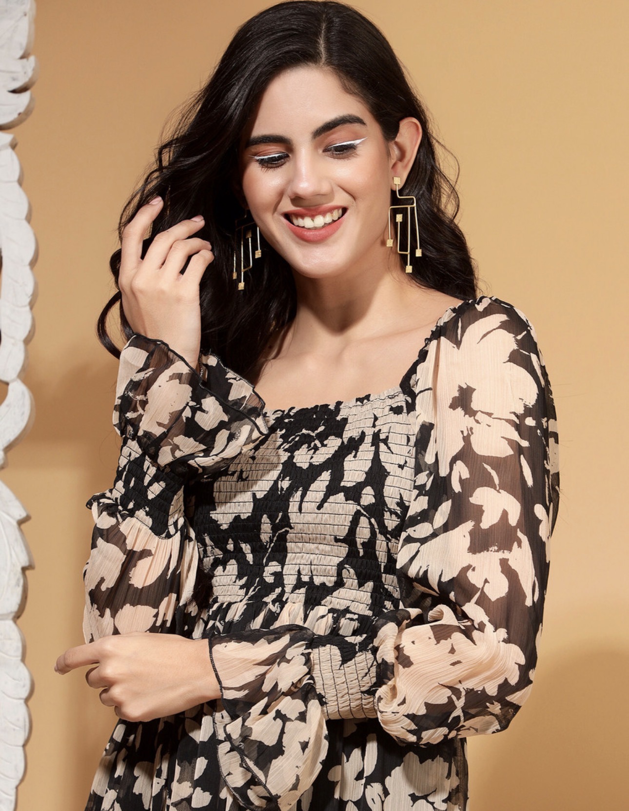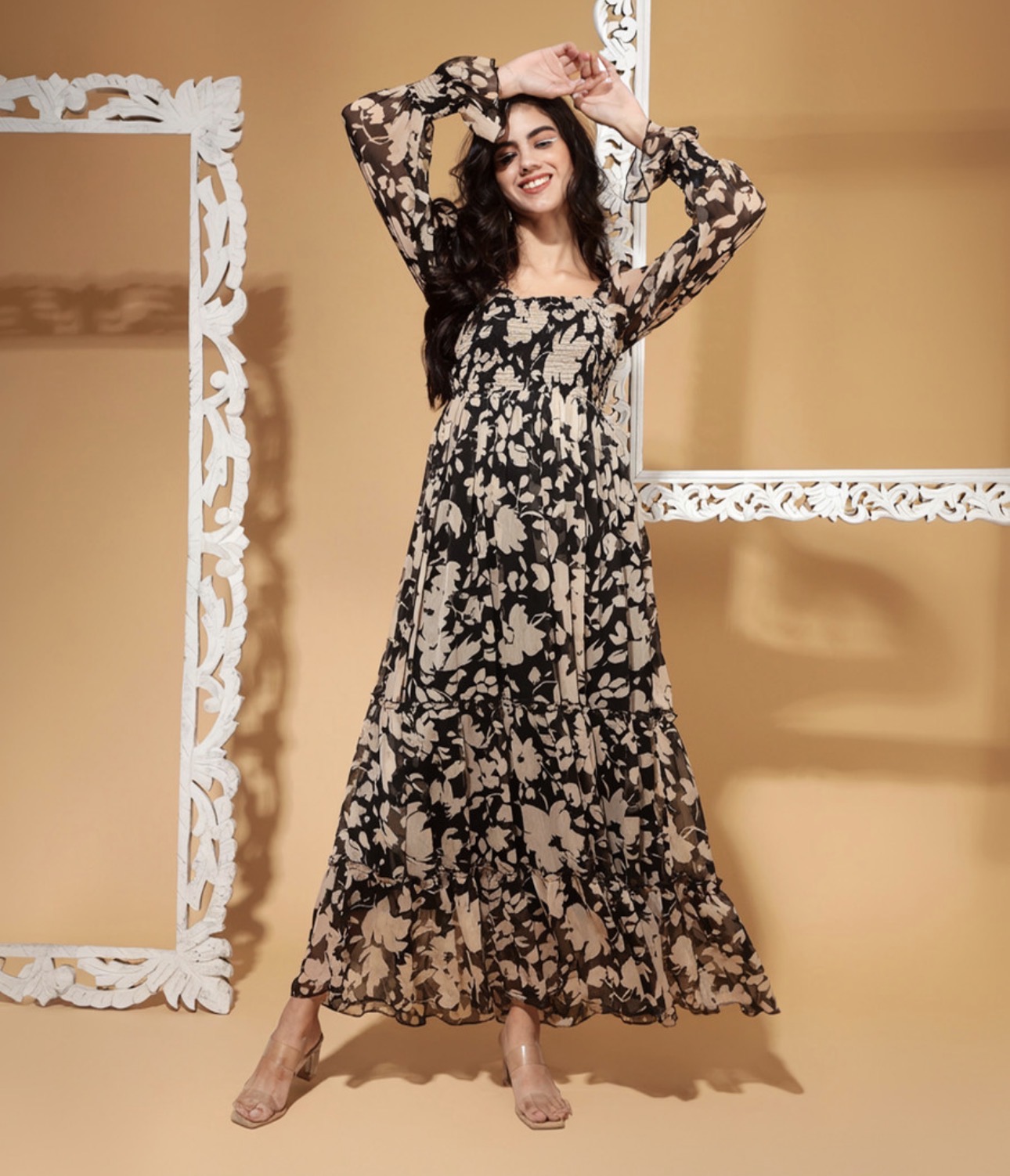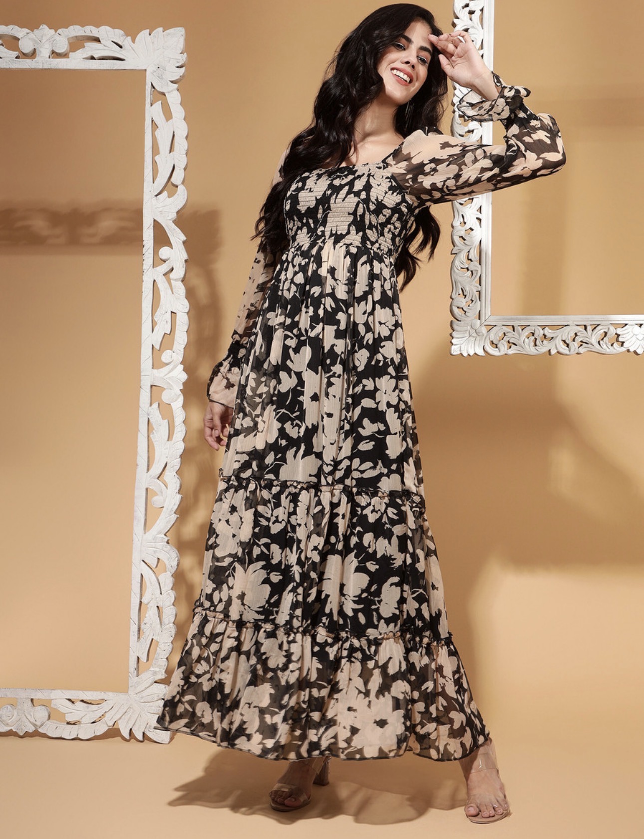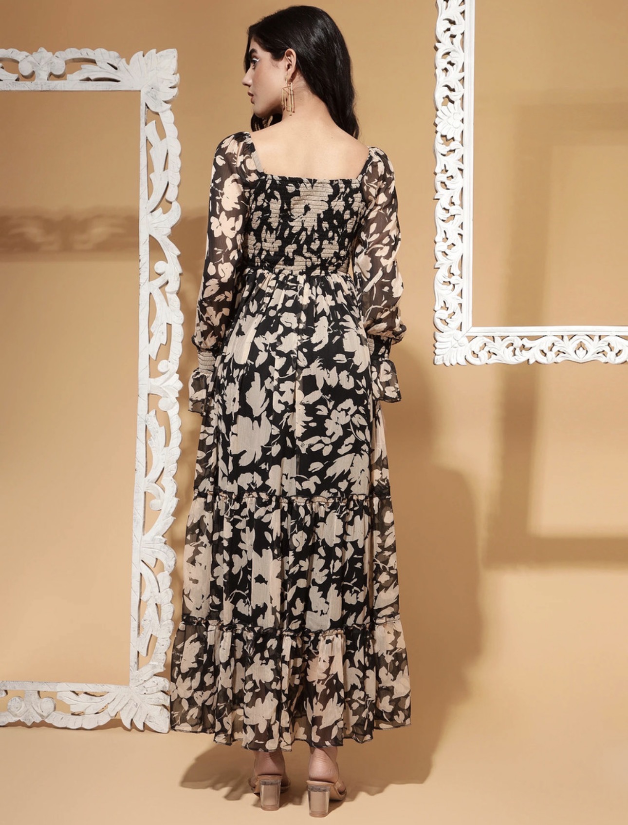Model Name : PRINTED SMOCKED TIER DRESS WITH SLEEVES