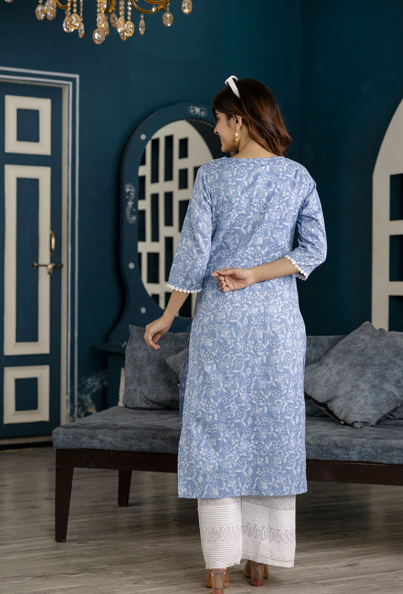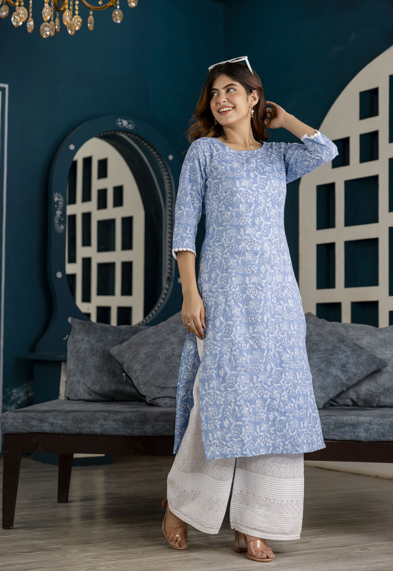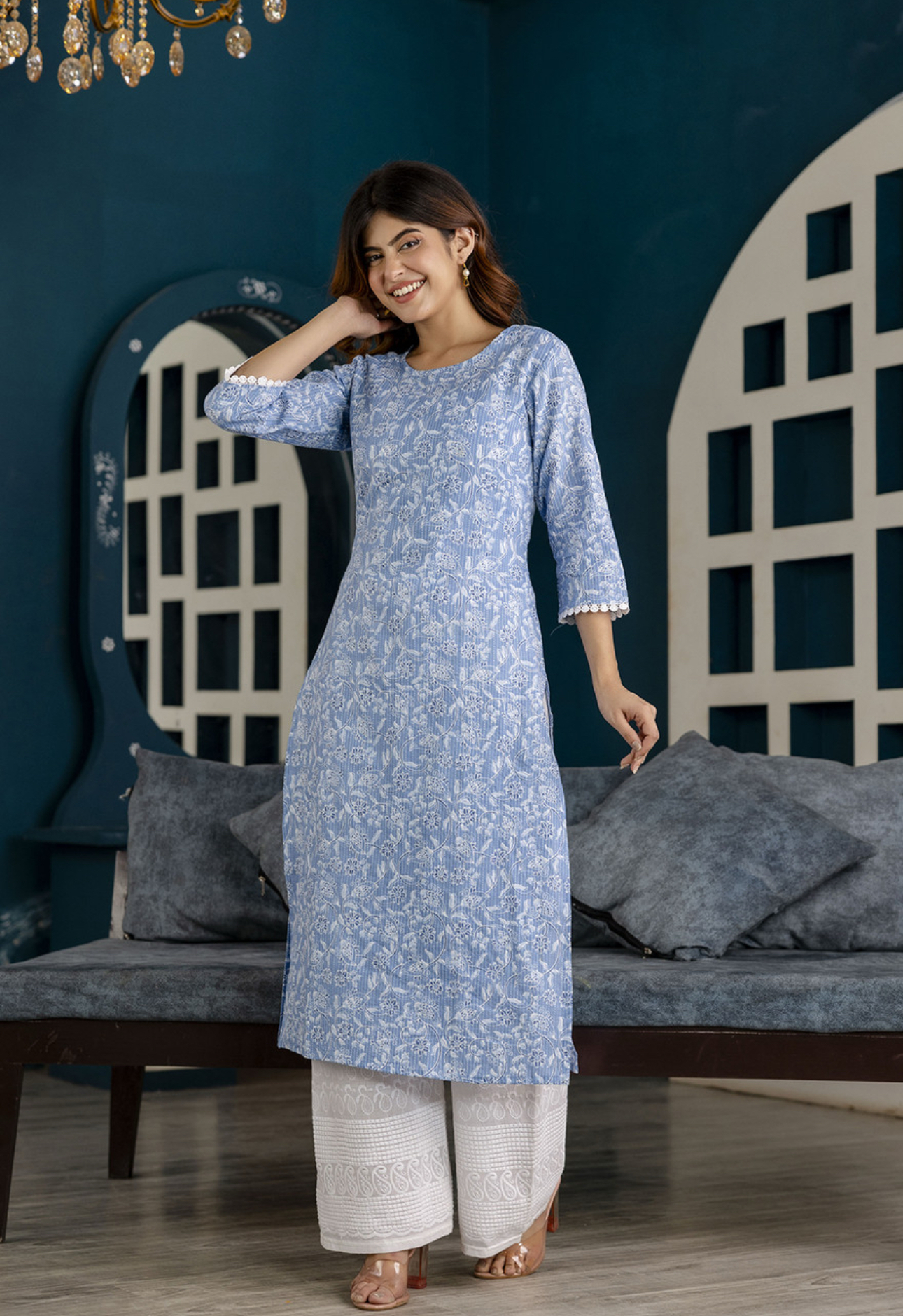 Women Blue Printed Straight Kurta with Three Quarter Sleeves